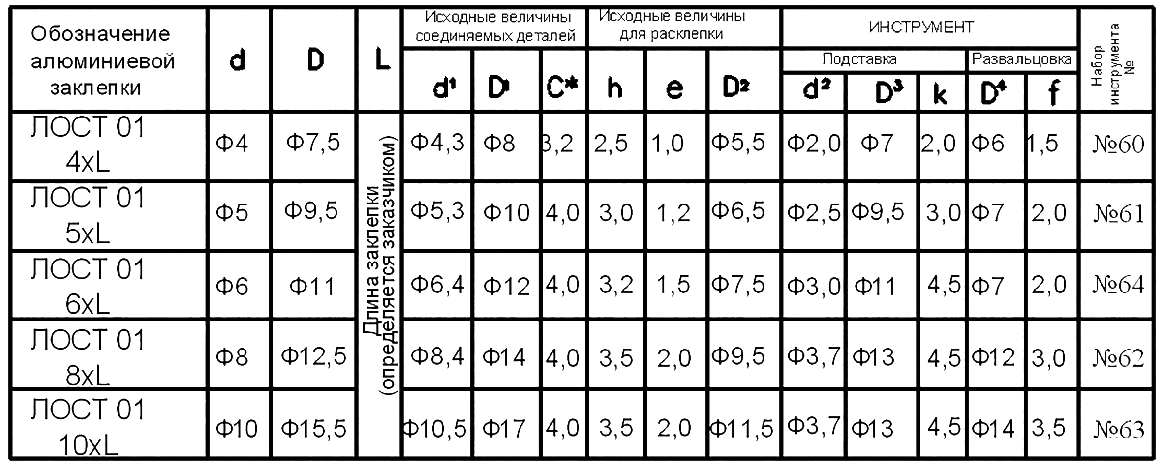 Фирма предлагает наборы инструментов для расклепывания заклепки «ЛОСТ», при заказе необходимо ссылаться на номер набора (см. таблицу).